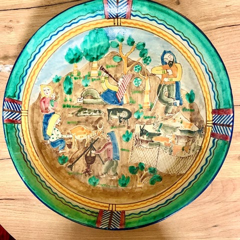 Rund väggkonst med reliefmotiv i flera nivåer. Motivet består av vågformade fält i svart, rött, brunt och vitt med markerade linjer i metallic/guldton. Ytan är strukturerad och tredimensionell, vilket ger ett skulpturalt intryck på väggen. Passar som dekorativt inslag i vardagsrum, sovrum eller hall. Material och exakta mått är okända.