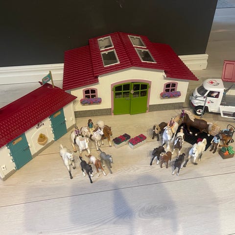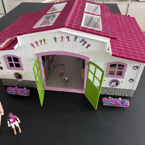 Schleich hästgård lekset med stall och hästar. Setet innehåller en större hästgårdsbyggnad med rosa tak, öppningsbara dörrar och fönster samt dekorerade väggar. Till gården hör fristående stallboxar, hagar med staket samt flera hästfigurer och tillbehör som ryttare, foder och utrustning. Passar för lek med häst- och stallmiljö och kan kombineras med andra Schleich-figurer och -set i samma skala.