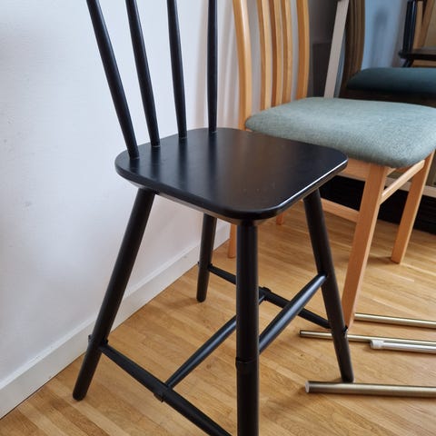 IKEA juniorstol för barn AGAM. Klassisk pinnstolsmodell med ryggstöd bestående av flera pinnar och lätt rundad överkant. Stabil. Har några sågmärken på ryggstödet och några nysatta klistermärken som såklart går att ta bort.