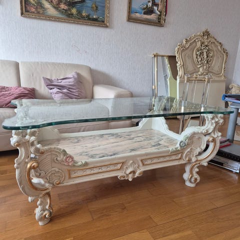 Exclusivt italienskt soffbord i handgjord massivt ädelträ. Glasskiva ovan och marmorskiva under.