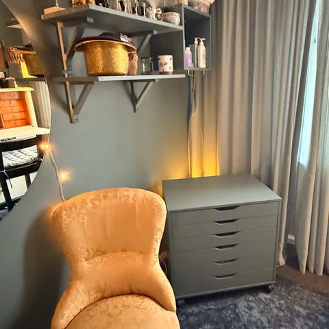 Insidan av bardel med glashylla samt glasskiva i botten, kopplade ben.
