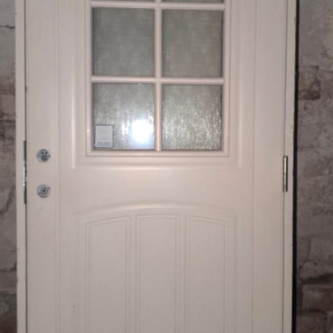Ytterdörr i vit färg med övre del försedd med fyra glasrutor i spröjsat utförande. Dörren har plats för låscylinder och handtag på vänster sida sett utifrån. Passar som entrédörr eller sidodörr till bostad, förråd eller liknande utrymme.