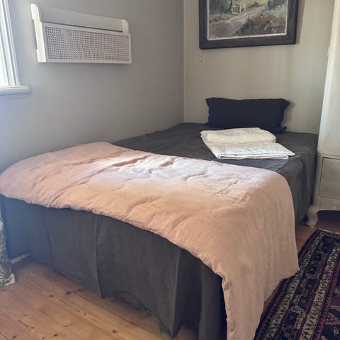 IKEA säng i vit färg med runda träben. Sängen har en enkel och rak design med rundad huvud- och fotgavel. Passar som enkelsäng i sovrum, gästrum eller barnrum. Materialet är en kombination av målad skiva och ben i trä med ljus ytbehandling. Madrass, täcke och kuddar kan användas efter eget behov beroende på önskad komfort och stil i rummet.