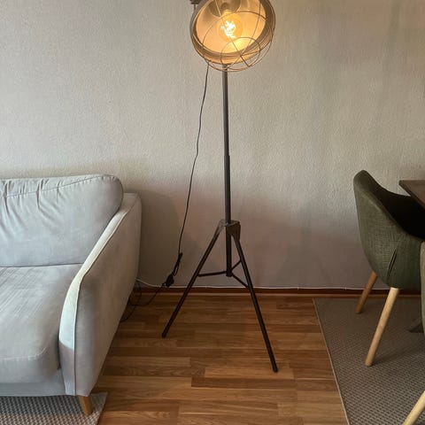 Jag säljer en effektfull golvlampa i loft-/industristil med en strålkastare på ett trästativ.
