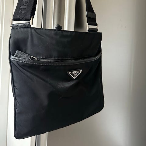 Prada midjeväska i svart tyg för unisex. Väskan har justerbart midjeband med spänne och flera fack med dragkedja på framsidan. Typisk triangelformad Prada-logotyp på framsidan. Passar för vardagsbruk och förvaring av mindre personliga tillhörigheter som plånbok, nycklar och mobiltelefon.