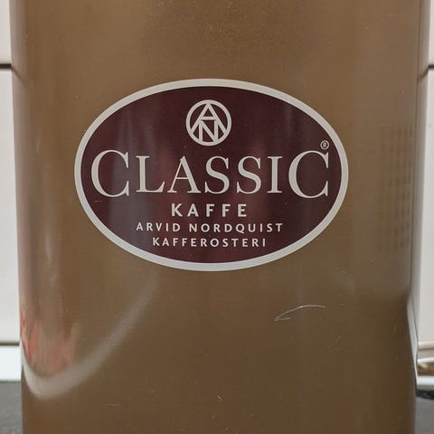 Blå Mocca kaffeburk. Några mindre rostfläckar i underkant men i gott använt skick. Bra bruksskick.