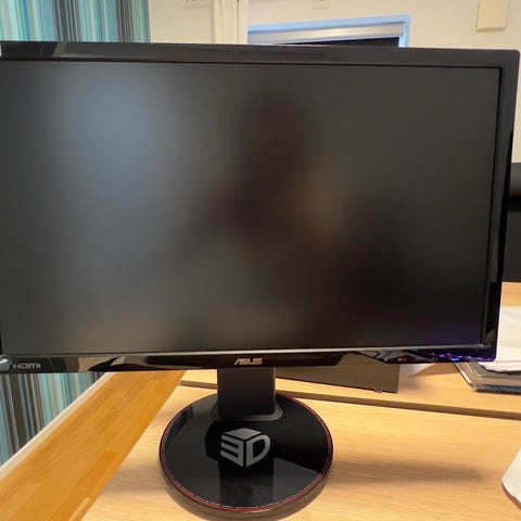 Asus bildskärm, 25 tum, i svart. Modellnummer VP247. Passar för arbete, studier, gaming och allmänt bruk. Skärmen står på en rund fot och har HDMI-utgång på baksidan. Elsladd medföljer.