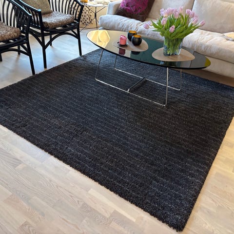 IKEA matta Vindum i vit/svart färg. Mattan har tät, mjuk lugg med struktur som ger en ombonad känsla. Passar exempelvis i vardagsrum eller sovrum på hårda golv som parkett eller laminat.