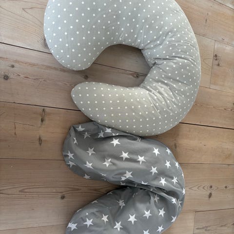 Rätt Start amningskudde med rosa överdrag och vitt elefantmönster. U-formad kudde som ger stöd vid amning eller flaskmatning.