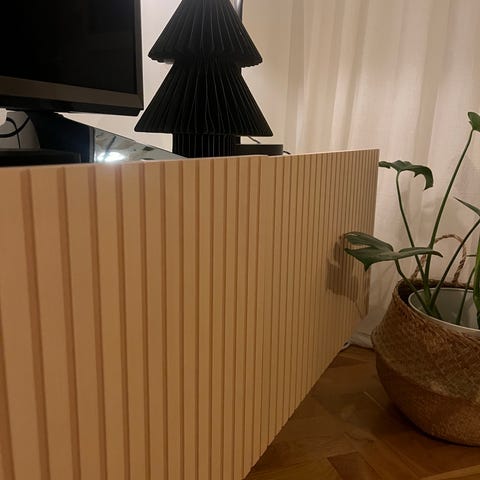 De har suttit vägghängda på rad, därav har två sidor skruvhål. Inga problem om du ska använda möbeln som en lång förvaring (ex. med en av deras snygga toppskivor) alt ställer skruvhål på dold sida.