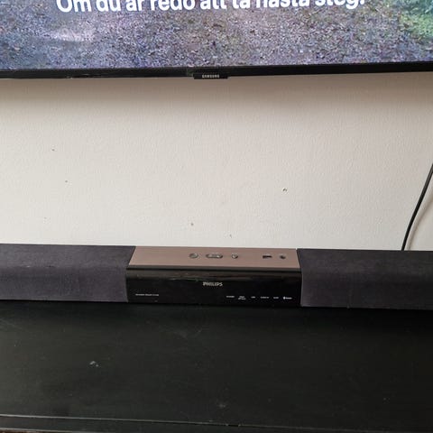 JVC soundbar med subwoofer i mörkgrått. Modellnummer TH-D337H. Systemet består av en långsmal högtalarenhet som placeras framför TV:n samt en subwoofer med basport på framsidan. Subwoofern kopplas till högtalarenheten med en sladd som är lång så det finns möjlighet att placera den en bit bort från TV:n. Fjärrkontroll och strömkabel ingår enligt bilder.