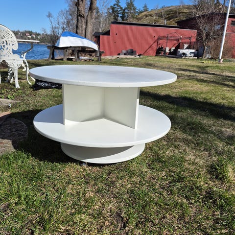 Ikeas klassiska soffbord formgiven av Karin Mobring. Blått betsat snurrbart.