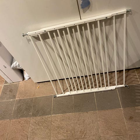 Barngrind/trappgrind i trä från Kaxholmens sängfabrik. Bredd 108 cm. Passar bra för öppning på 100 cm. Höjd 75 cm. Smidig att öppna och stänga. En traditionell trappgrind.