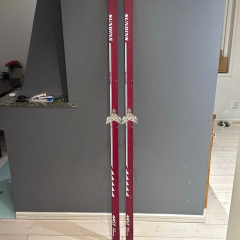Madshus Ultrasonic längdskidor i röd färg. Skidorna är utrustade med bindningar som syns på bilderna. Passar för klassisk längdåkning. Ytan har tydliga Madshus-loggor och modellbeteckningen Ultrasonic. Skidorna kan användas tillsammans med längdpjäxor som är storlek 35