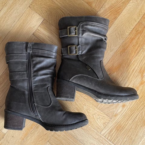 Brun stövel av märket Bata. Utsmyckningen är avtagbar med tryckknapp. Stlk 37