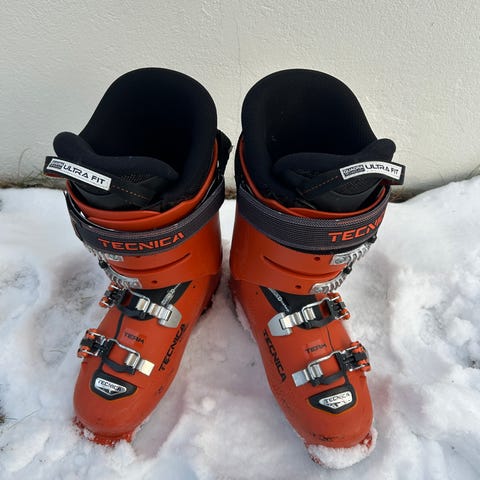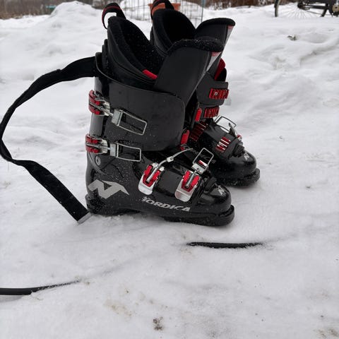 Ett par Nordica grå storlek 24-24,5( pris 200 kr), alla paren har innersko med vadderad kant och rem upptill för enklare hantering. Passar för alpin skidåkning i pist och allroundbruk.
