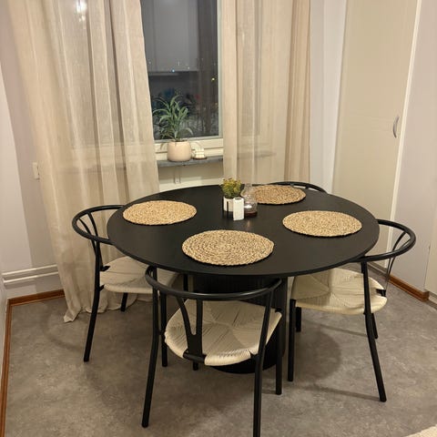 Bord Mariedamm, mörk skiva ser ut som marmor diam 105cm. 4st stolar Stein, transparent. Nypris:5700kr
