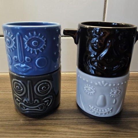 Setet innehåller muggar med reliefmönster i form av olika ansikten.