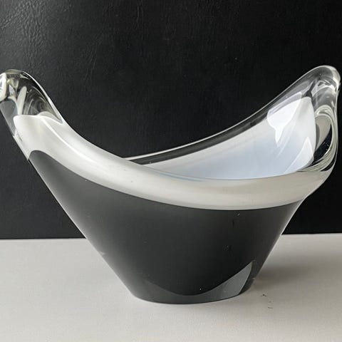 Vas i svart och vitt glas från Flygsfors Glasbruk. Denna vas har en elegant design som passar i de flesta hem. Vasen är tillverkad av glas och har en kombination av svart och vitt som ger den ett stilrent utseende. Höjd 26 cm. Vikt 1250 g. Inga nagg.