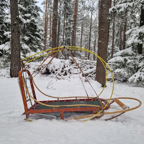 Hundsläde/pulka i trä med rött överdrag. Släden är utrustad med såväl hundsele som midjesele. Den har skaklar av bambu. Lämplig för hundkörning och transport av packning på snö.