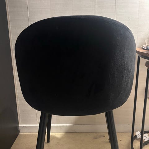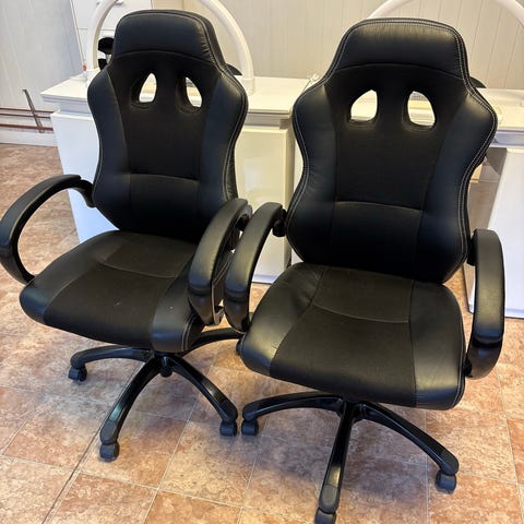 Svarta salongstolar i läder, avsett för salongverksamhet eller hemmabruk. Justerbar höjd.