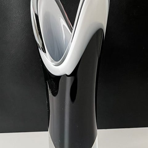 Glasskål i svart och vitt från Flygsfors Glasbruk. Skålen har en elegant design med vågiga kanter. Skål 17 x 13 cm, höjd ca 10 cm, vikt 740 g. Perfekt för dekoration. Inga nagg.