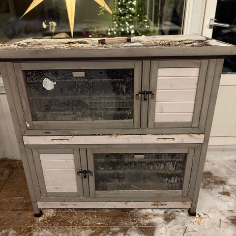 En bur för smådjur och kaniner. Gallerlucka saknas. Mycket gott skick då buren använts under mycket kort tid. Hö, halm och strö enligt foto. Går att använda utomhus men den är inte anpassad för vintern