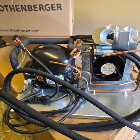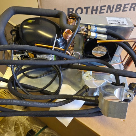 Mycket lite använd rörfrys. Ca 3 år gammal. Elektrisk frysning av rörledningar upp till 2". Ingen inställning, ingen reglering. Kompakta fryshuvuden med speciella geometriskt utformade urtag för infästning av olika rördiametrar. Användbar även i trånga utrymmen. För alla rördimensioner från Ø 1/4 - 1" eller 15-42mm behövs endast ett fryshuvud utan extra frysinsatser. 230V, 50Hz, 430W.
