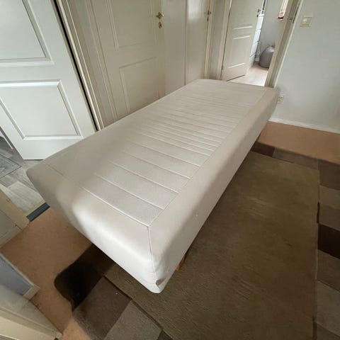 IKEA Sultan Tveit resårbotten med bäddmadrass. Sängen består av en resårbotten med ljus klädsel och träben samt en vit bäddmadrass ovanpå. Passar som enkelsäng i sovrum, gästrum eller studentboende. Sängen används med standardmått på sängkläder för enkelsäng. Längd 200 cm, bredd 120 cm.