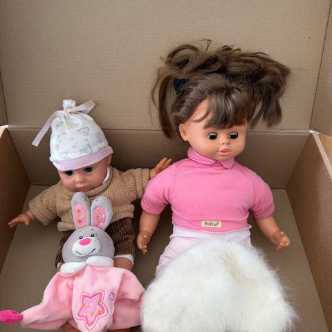 Två dockor med två påsar dockkläder