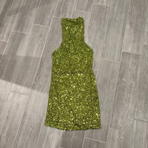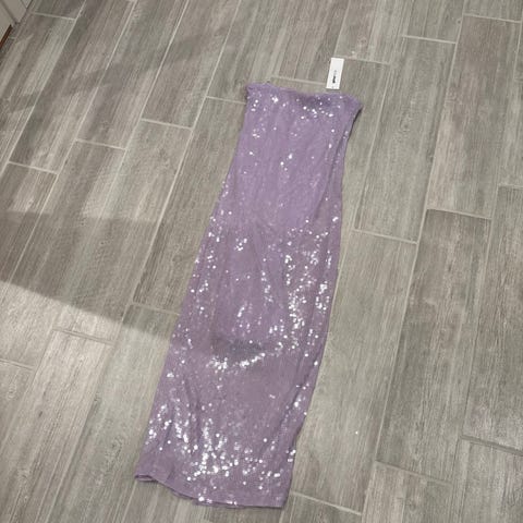 Gina Tricot party-/cocktailklänning för dam i storlek S. Klänningen är vit och täckt av paljetter. Axelbandslös, figurnära modell med längre längd. Passar för fest- och kvällstillfällen.