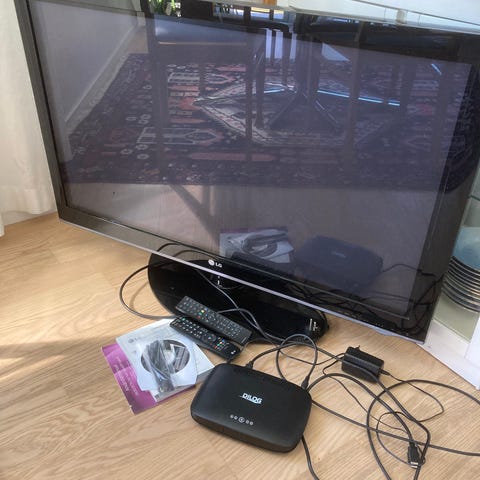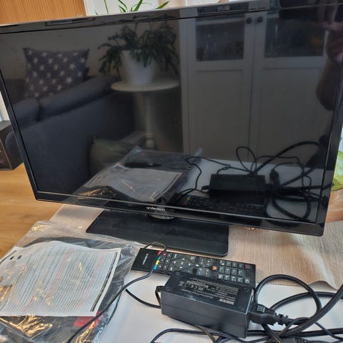 Apple TV mediaspelare i svart färg. Enheten ansluts till TV via HDMI och strömförsörjs med nätkabel. Fjärrkontroll i aluminium ingår enligt bild. Lämplig för uppspelning av digitalt innehåll från kompatibla Apple-enheter och olika streamingtjänster, beroende på modell och mjukvarustöd. Kontrollen till tvn saknas men går att starta bak
