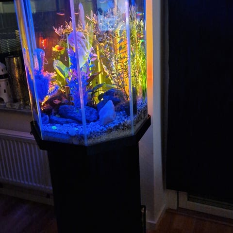Akvarium 54 L komplett med belysning, fristående svart möbel med hyllor, sandbotten, konstgjorda växter, dekorationsstenar , pump, doppvärmare och fiskar :