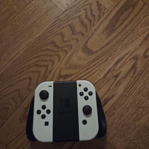 Nintendo Joy-Con handkontroller i två färger: en blå vänsterkontroll och en gul högerkontroll. Joy-Con används trådlöst tillsammans med Nintendo Switch-konsolen och har inbyggda styrspakar, knappar och axelknappar. Kontrollerna kan användas både ihopkopplade med konsolen eller fristående i varje hand beroende på spel och spelstil.
