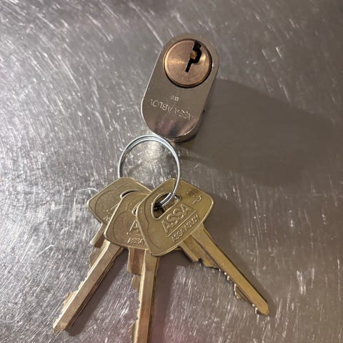 Låscylindrar i metall med 3 st nycklar. Båda har suttit i en butiksdörr dvs dubbla lås. Ovala som synes på bilden. 1200 el 1300 serie från Assa, mest troligt 12.