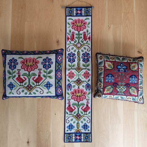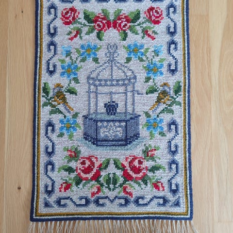 Väggbonad med mönster i flera färger, bland annat brunt, vitt, orange och grönt. Bonaden har en tydlig bård runt kanten och ett geometriskt, återkommande mittmönster. Baksidan är i vävt tyg.