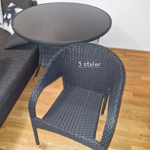 Matgrupp ute rund bord med glas och stolar i konstrotting grå