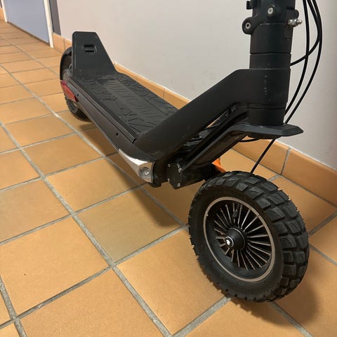 Elsparkcykel i grå färg. Modellen har ihopfällbar konstruktion, fotplatta med halkskydd och luftfyllda däck. Utrustad med el frambroms. De är en pro medel så går i 25Kmh! OBS! Punka fram och bak därav priset.