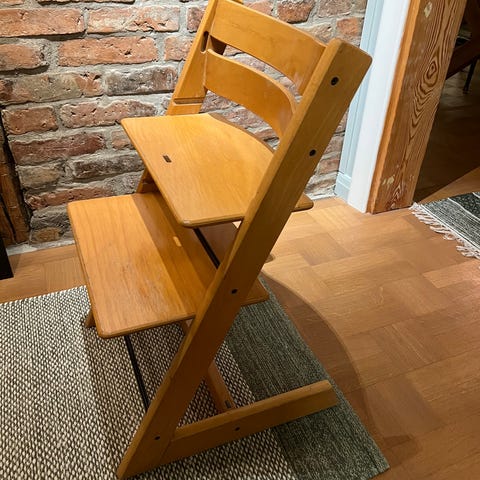 Hej, säljer vår gamla barnstol då den inte används längre. Det är bra och går att användas utan problem men har lite färg som försvunnit här och där.