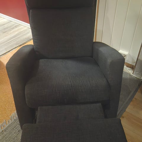 Mio soffa med tillhörande fåtölj och pall i mörkgrått tyg. Soffan är en större hörn- eller divansoffa med flera sittplatser och lösa ryggkuddar. Fåtöljen är en hög ryggfåtölj med utfällbart fotstöd. Pallen är klädd i samma mörkgrå tyg som soffan och fåtöljen och har måtten cirka 65 x 65 cm och höjd cirka 40 cm. Passar som sittgrupp i vardagsrum eller TV-rum.