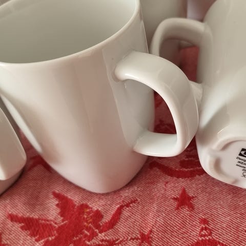 Båda muggarna har en höjd på 9,5 cm och en mynning med diameter på nästan 11,5 cm.