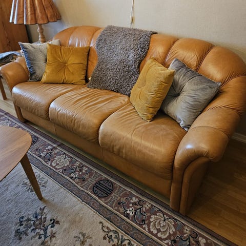 Välanvänd med patina, perfekt för man cave, jaktstuga eller seriös renovering. Slitna sitsar, skada på ena sitsen skinnbit under. Sittdjup 54cm, sitt bredd 100cm. Otroligt bekväm att sitta/ ligga i!