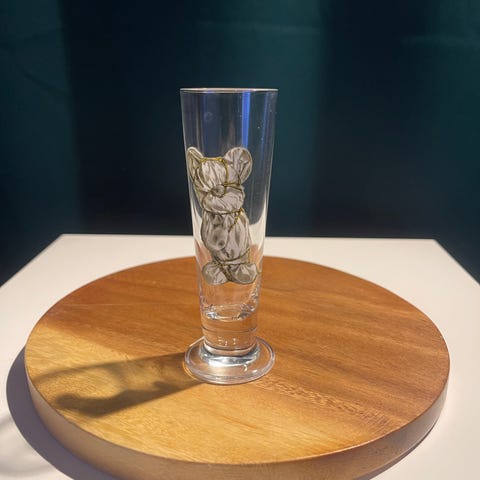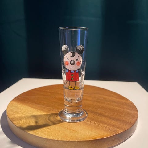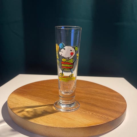 Ett snapsglas med motivet "Plumpmus", designat av den svenska konstnären Lasse Åberg.
