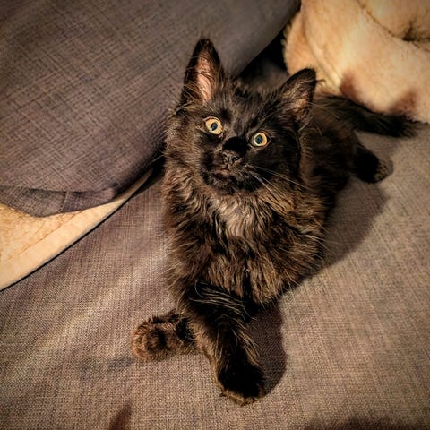 Gosig och snäll katt som passar bra med barn. Kan vara blyg och vaksam i början med andra katter men hon är van att bo med flertal katter. Hon har aldrig varit runt hundar så där vet jag inte om hon skulle gå ihop med dem eller ej.