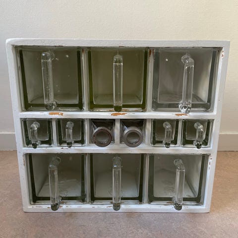 kryddställ i trä med flera fack och tillhörande glasburkar. Passar för förvaring av kryddor eller små köksartiklar på bänk eller i skåp. Träkonstruktion med rektangulär form och separata fack som håller burkarna på plats och ger översiktlig förvaring i köket.