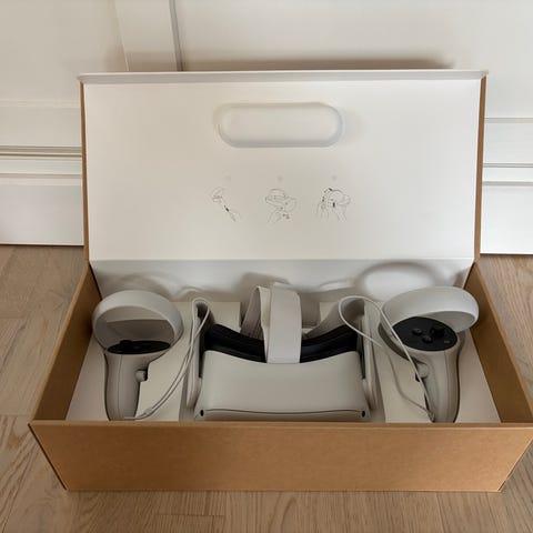 Beskrivning: Meta Quest 2 jag köpte 1-2 år sen ungefär. Bra skick, försökte rengöra den så bra jag kunde med microfiber duk.