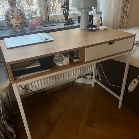Ett vitt skrivbord på 100cm från Amazon (se alla mått sista bilen.) Säljer för att jag möblerar om och de får inte plats där jag ska ha de, nyligen köpt, bra kvalitet, liten smink fläck på insidan av ena lådan. Annars ser och är nästan helt ny. Ordinarie pris 1000kr säljer för 500😊