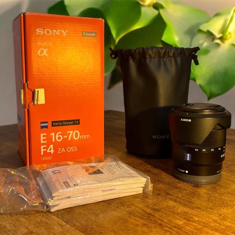 Objektivet levereras komplett med original tillbehör som kartong, motljusskydd, båda objektivlock och förvaringspåse enligt bild.