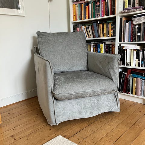 Fin fotölj från Mio modell Livorno i mörkgrå sammet från djur och rökfritt hem. Hämtas i Majorna.