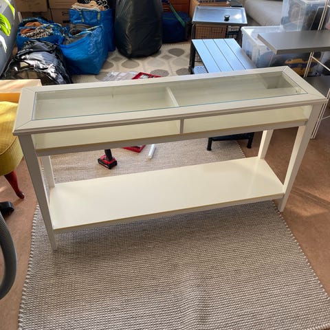 Skänk med glasskiva och två hyllplan. Väldigt varsamt använt.